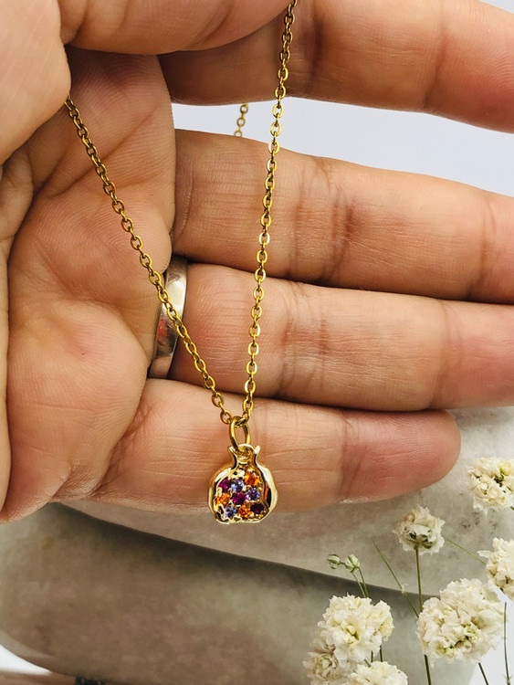 اگر به دنبال یک گردنبند خاص،ظریف و کاملا مناسب شی یلدا هستی،این گردنبند انار نگین دار دقیقا همون انتخابیه که دنبالش بودی.طراحی الهام گرفته از انار،با نگین های درخشان قرمز و بنفش،جلوه ای شیک و زنانه به استایل تو می ده.